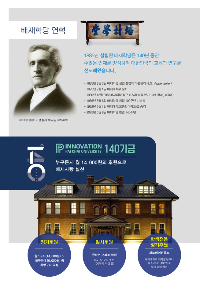 제목배재학당 창립 140주년 기념기금 「피노베이션140기금」 안내
