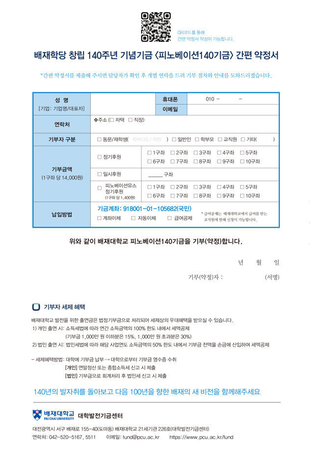 배재학당 창립 140주년을 맞아, 학교의 역사와 정신을 함께 기념하고 미래 발전을 응원하는 「피노베이션140기금」을 새롭게 마련했습니다.