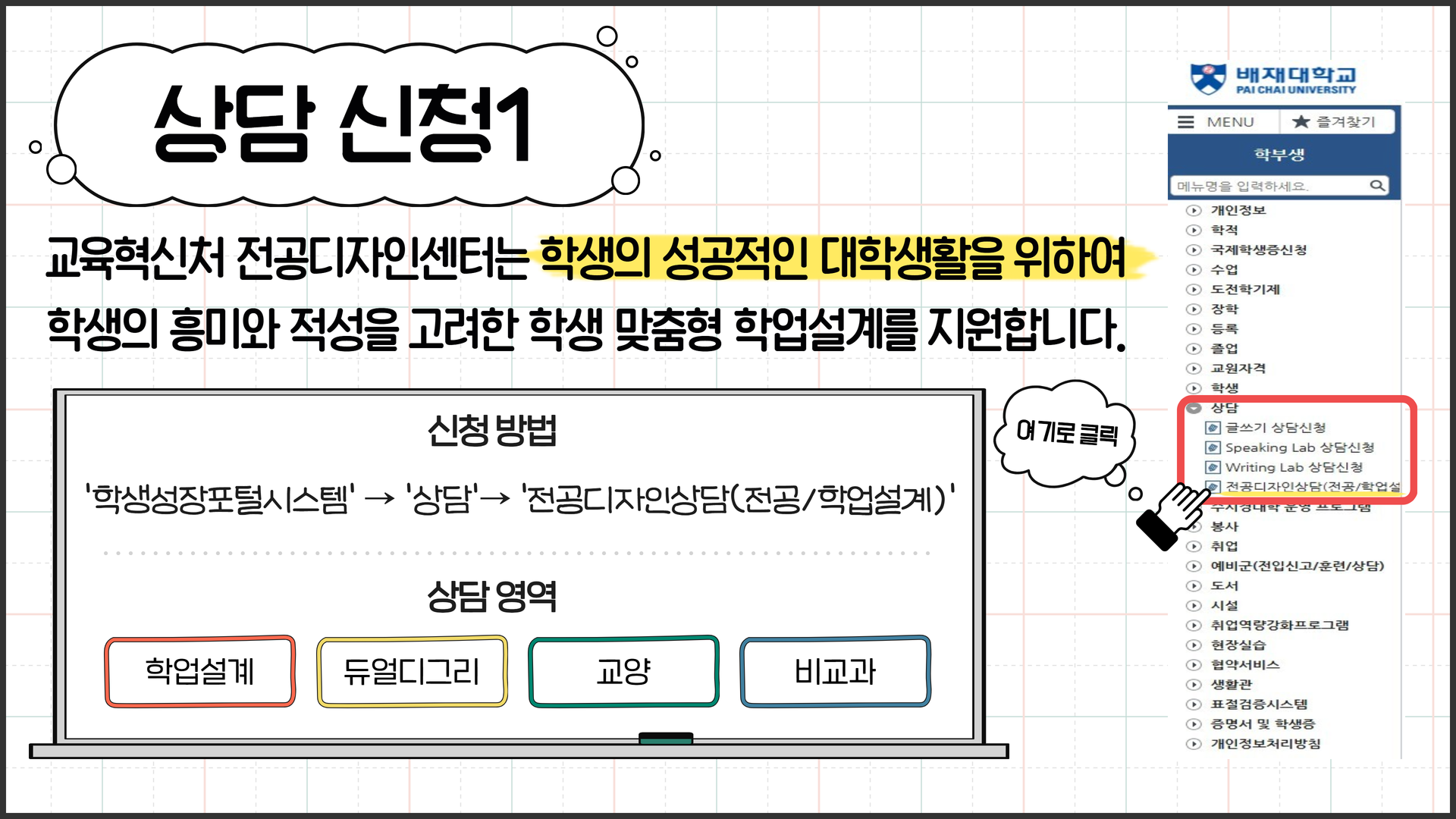 교육혁신처 전공디자인센터에서는 2026학년도 1학기 학업설계 상담을 제공합니다.