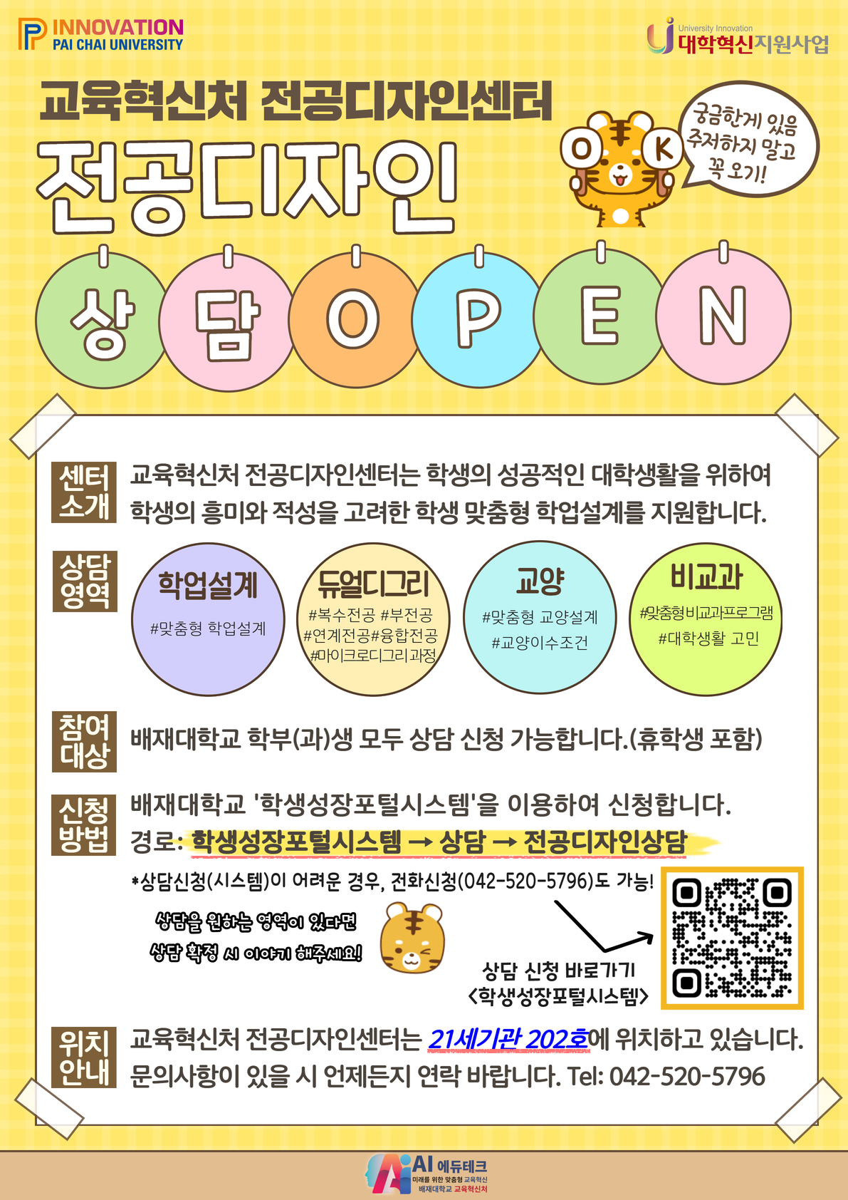 학업설계, 듀얼디그리(복수전공, 부전공, 연계전공, 융합전공, 마이크로디그리 과정), 교양, 비교과 등 관련해서 상담을 제공하오니 아래 신청 방법 참고 및 방문(P202호) 또는 전화 신청(042-520-5796) 하여 주시기 바랍니다.